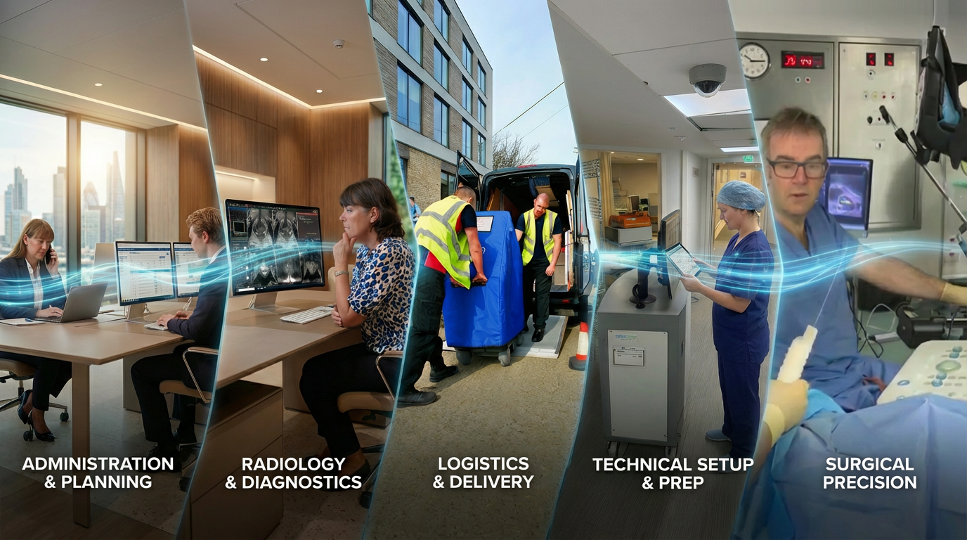 All your secretary needs to do is call us. Our coordination team handles imaging transfer, schedules Dr Allen's contouring, arranges on-site specialist deployment, and ensures everything is ready before you step into theatre.